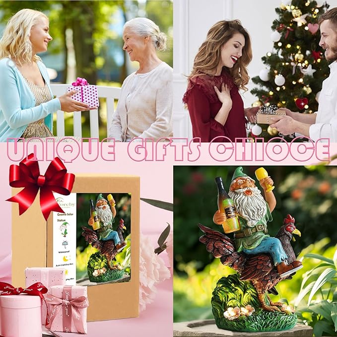 • 🌟【Funny Outdoor Decortaion Design 】Funny gnome sculpture with a solar wine on hand,riding a rooster in the garden , It has a funny expression and a tilted head, which making it a beautiful and eye-catching addition to your garden or home.