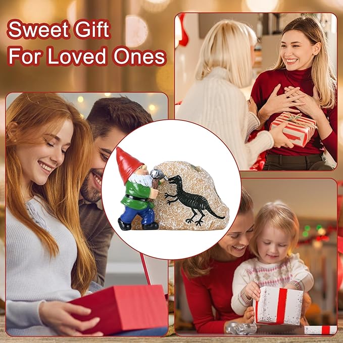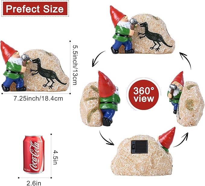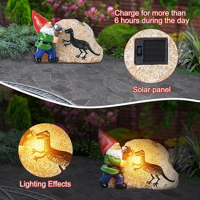 • 【CUTE GNOME STATUE】This garden gnome statue holds a hammer and carves a dinosaur on a solar resin stone,this solar garden archaeology gnome statue is a great decoration to yard,flowerbed,walkway,patio,lawn.light up warm lights every night to welcome your family or friends, add some wonder and charm to your garden