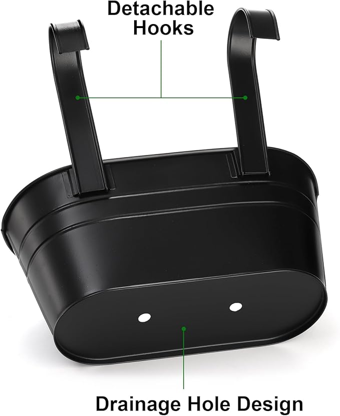 • Balcony Rail Planter Set: Package includes 6 black metal hanging planter pots. Breathable drainage hole at the bottom of the planer prevents water accumulation and keeps the soil drained and ventilated. An excellent choice for your lovely flowers and plants. Great for hanging on the fences, windows, walls, railings, flower stands, anti-theft nets, etc.