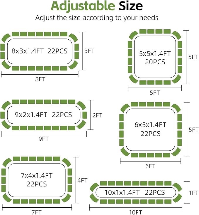 • 【 Adjustable size design 】 The GoCampDirect raised flower beds Kit features an innovative modular design and is available in 7' x 4'x1', 8 'x 3'x1', 9 'x 2'x1', 10 'x 1'x1', 6 'x 5'x1' and 5 'x 5'x1' configurations. This way, you can assemble the garden beds outdoor into a variety of arrangements based on your backyard, enabling you to create different sized raised flower bed according to your gardening plan.
