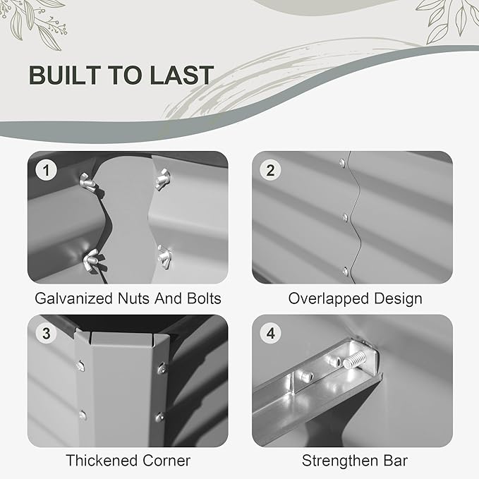 • Thicker Material: Made of thick galvanized steel plate with eco-friendly coating, rust-proof and durable. The 0.8mm thickness, reaching 1.8mm in the thickest part, ensures long-lasting raised garden beds' outdoor aesthetics.
