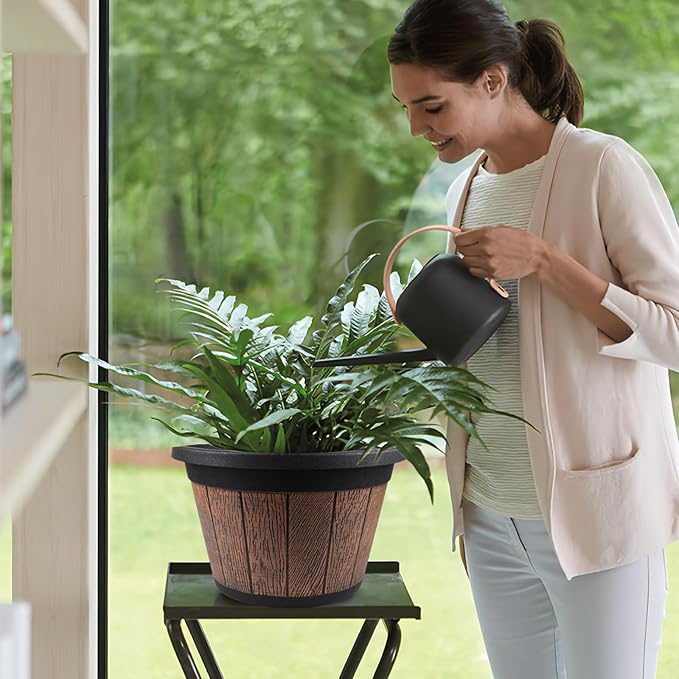 • 🌱【Vintage Design】4 Pack 14 inch large outdoor planters adopt vintage style to match your home decor, the rugged look and faux wine barrel design complements many different decorative styles. You can feel this peaceful rustic comfort when planting in your garden or front yard.