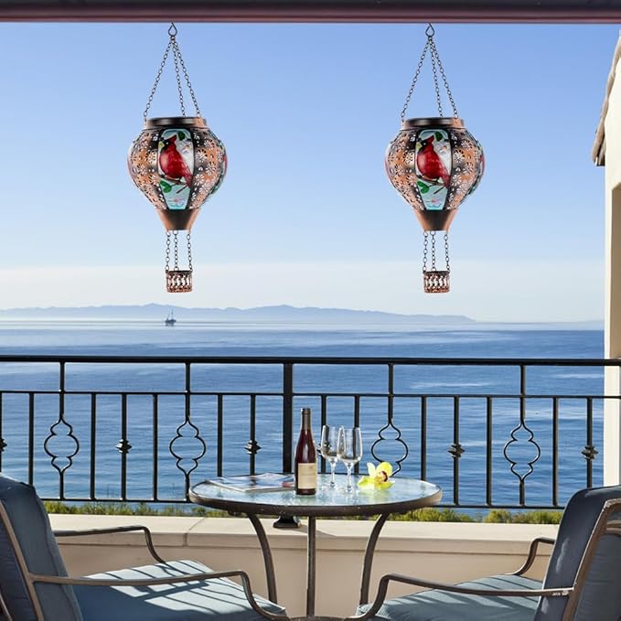 • Hot Air Balloon Solar Lantern: DREAMSOUL solar lanterns outdoor waterproof are made of metal and glass, with flower hollow patterns on the metal and cardinal patterns on the glass. The appearance of a hot air balloon and the flickering flame lighting design make the outdoor lantern look like a real hot air balloon, creating a warm and beautiful atmosphere for your garden