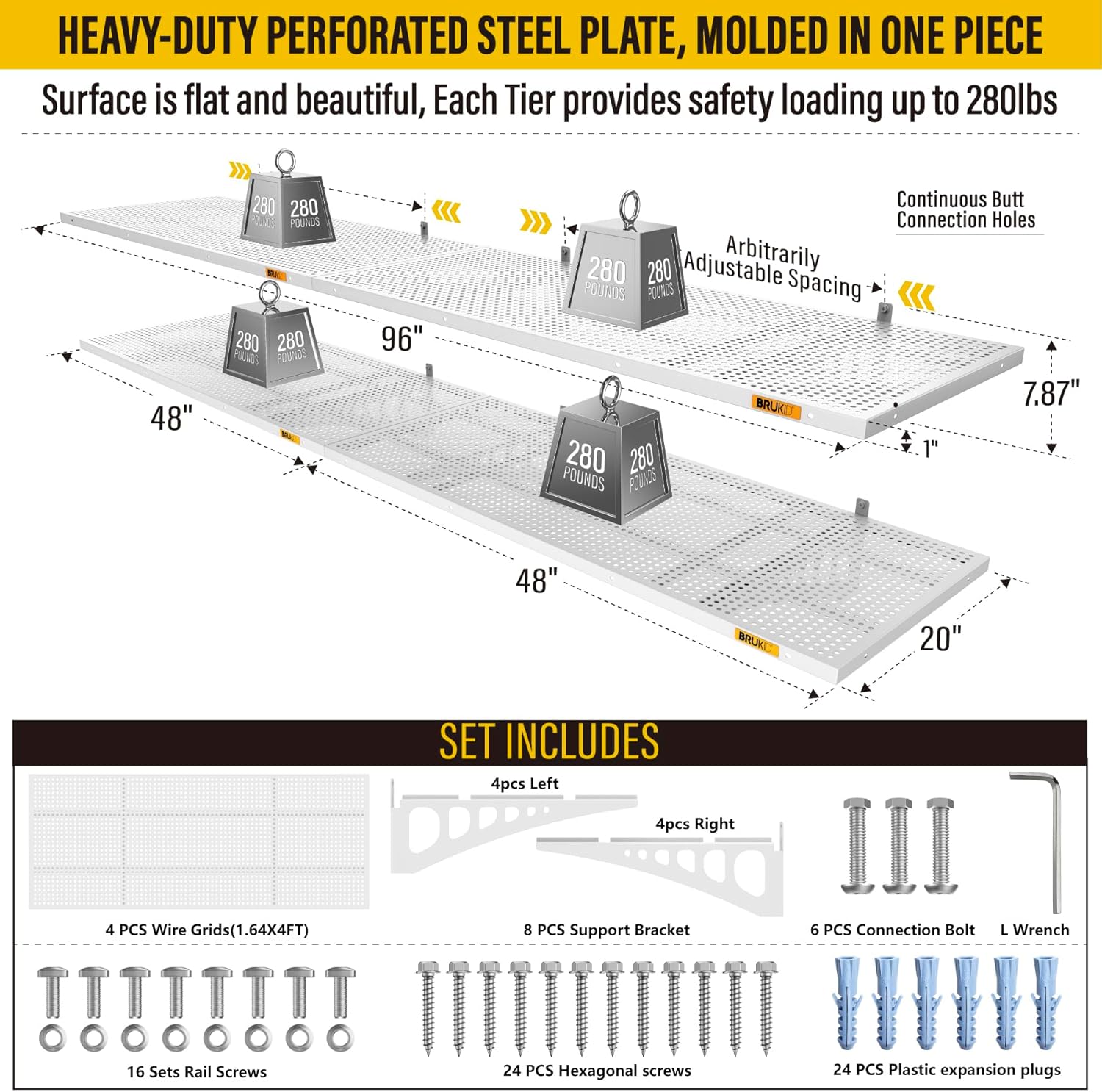 • SUPERIOR DESIGN: Wall shelf garage storage rack panel is made of whole piece of perforated steel plate bending and welding, the surface of matte high temperature powder baking paint, flat and smooth; the panel adopts slide rail design, can be adjusted by parallel left and right sliding at will; bracket can be freely installed in 45” range of the spacing of the wood wall keel, without affecting the precision connection with the panel, eliminating the worry of being unable to docking due to the mismatch of spacing points of load-bearing wood wall keel or inaccuracy of the installation of the bracket. It saves time and labor