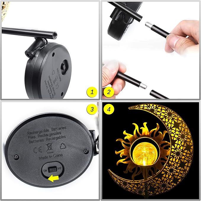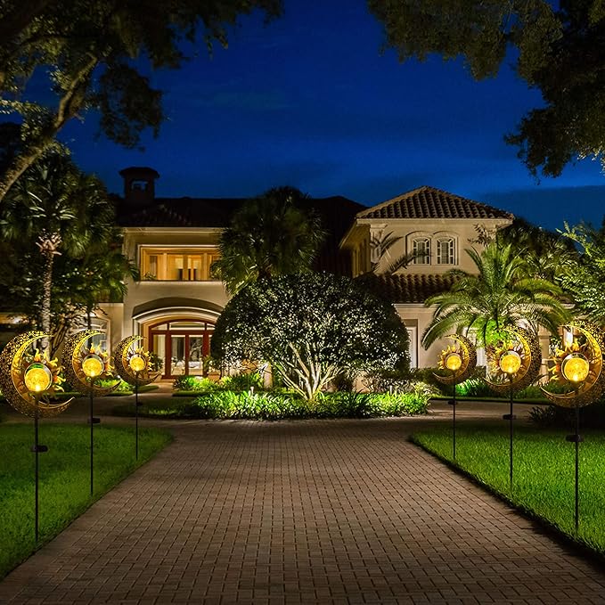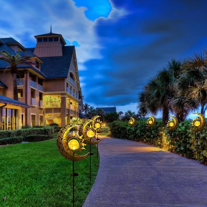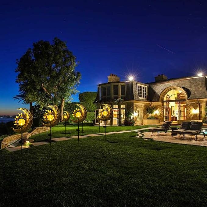 • OUTDOOR DECORATIONS GIFT IDEAS: These decorative stakes design with sun, moon showcase warm white LED lights that create a beautiful reflection of patterns when illuminated. They add an enchanting landscape lighting to your home outside, lawn, patio, garden, backyard, or pathway, enhancing the visual appeal of your outside space.