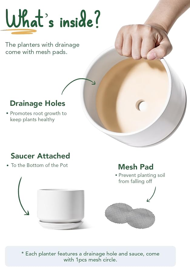 • Effortless Drainage: Each pot features drainage holes and a net that promotes healthy roots, preventing overwatering. The silicone plug lets you place ready-potted plants directly in the pots or plant in the soil (plants not included; saucer attached)