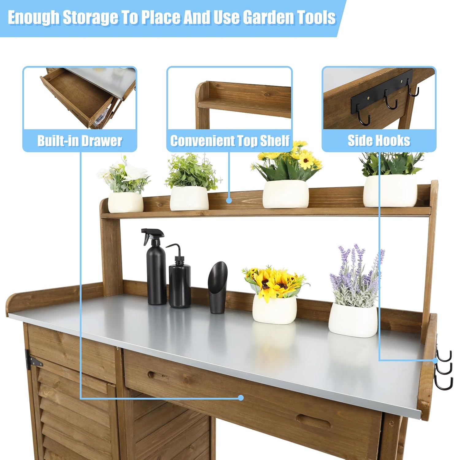 • 【Thoughtful Details】The top shelf of the work table can house your planted flowers and tools. The raised tabletop edges can prevent the falling of items on the top. The drawer, lower slatted shelf, storage cabinet and top shelf of the planting table make you store a variety of tools more easily. 3 side hooks are perfect for keeping your favorite trowel, trencher or other tools in arm's reach.