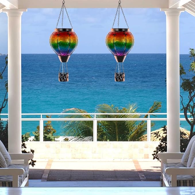 • Hot Air Balloon Solar Lantern: The solar lanterns outdoor waterproof has a unique design that incorporates the classic elements of a hot air balloon. Its shape resembles a hot air balloon floating in the air, with a candlestick hanging below. Coupled with the flickering flame design and rainbow-like colorful gradient colors, the outdoor lantern is full of dreamy atmosphere, creating a warm and romantic atmosphere for your garden