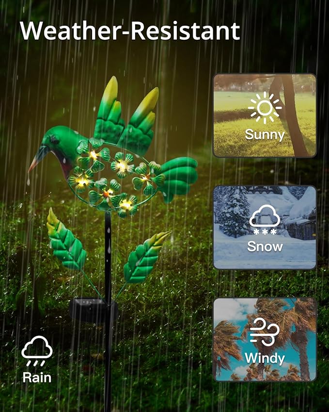 • 【Outdoor Solar Light Water Resistant】: The metal hummingbird garden solar light decoration is made of high-quality metal materials, which are waterproof and windproof and can be used in any weather conditions.