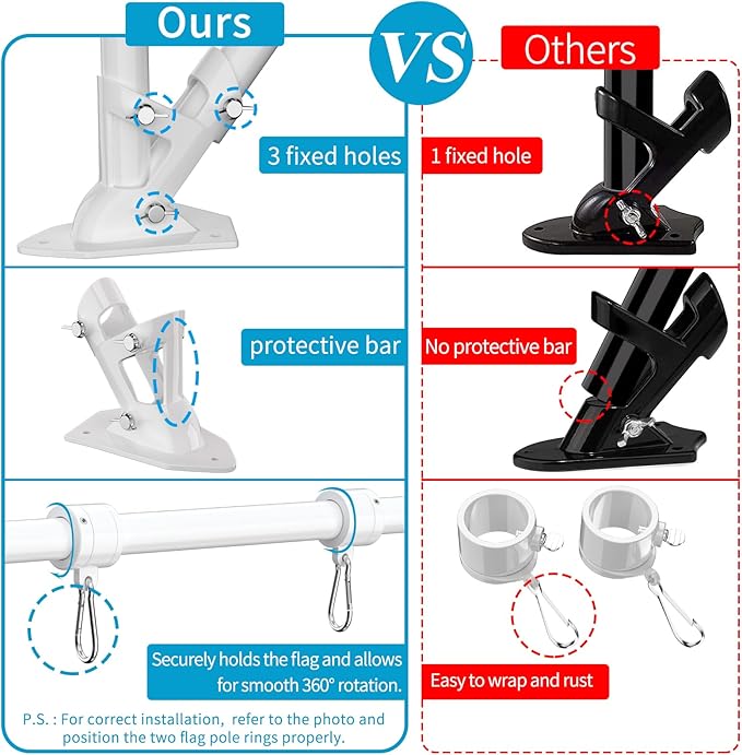 • 🇺🇲Upgraded Bracket and Tangle Free Rings: The high strength aluminum alloy flag pole holder has unique protective bar and 3 fixed holes to make the two-position (90° and 45°) flag pole more stable. The two new designed flag rings and two sturdy carabiners, which could make the flag tangle-free in the wind. And Adjustable length swivel flag pole kit can be installed according to the different size flags.