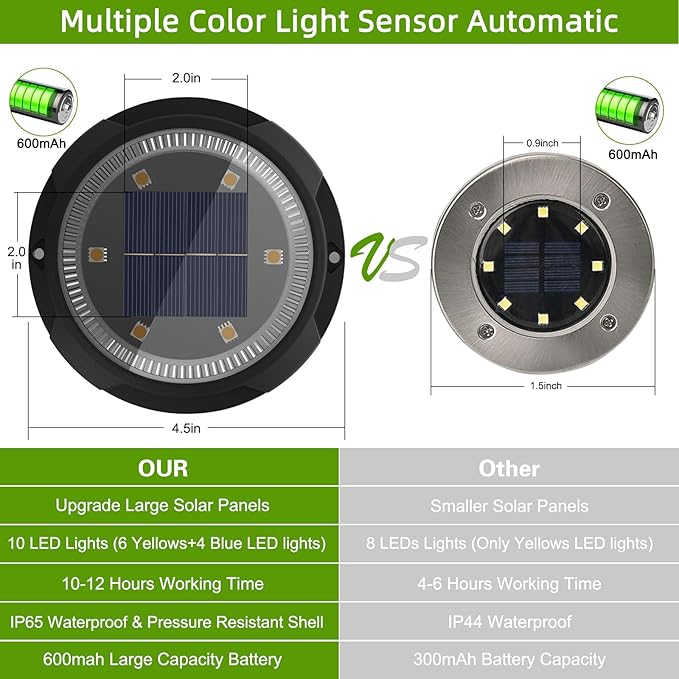 • 【2024 Upgraded Solar Outdoor Light】This solar garden lights comes with strong huge electronic storage function, 2x2in bigger solar panels(Others 0.9x1in), solar energy is automatically charged for 3-5 hours, and it will light up for 10-12 hours at night, aster charging and longer usage time. Longer lasting light decoration for your garden.
