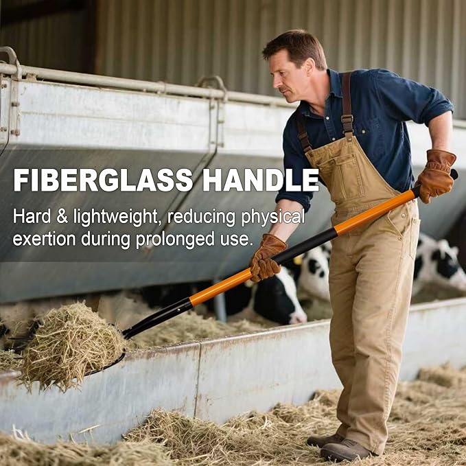 • High Quality Material: The handle of the heavy duty pitchfork made of thickened fiberglass material, which is lightweight, sturdy and not easy to break. The garden fork head is made of high quality carbon steel, which is sturdy and not easy to deform. The surface of the pitch fork for compost head is coated with rust-resistant coating, so it is not easy to rust even when it is used in a humid environment.