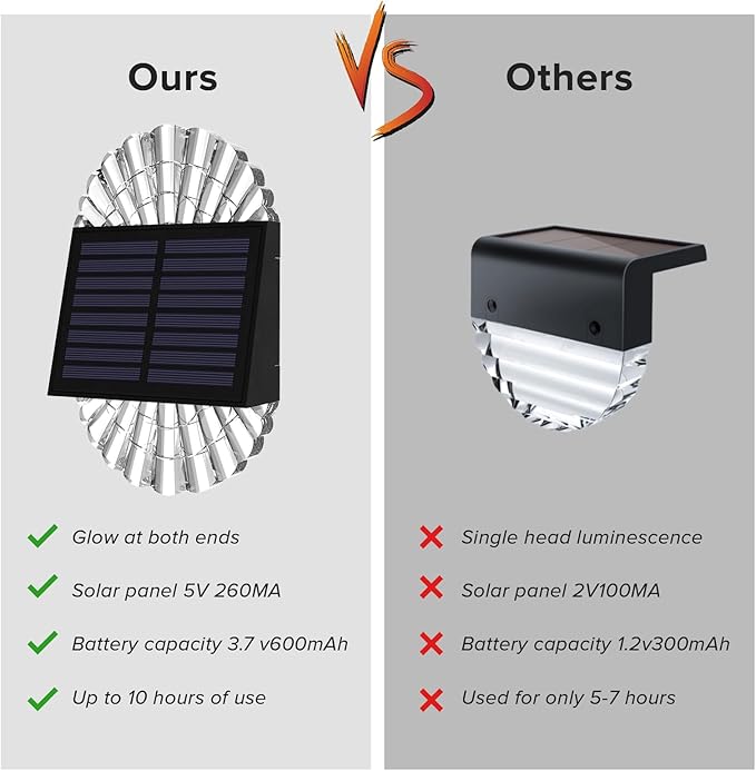 • 【Easy Installation】Our solar deck lights outdoor have two installation methods, you can either place it vertically or horizontally. And you can use the screws with anchors or adhesive tapes to install them, which are all included in the package. If you have any questions please feel free to contact us.