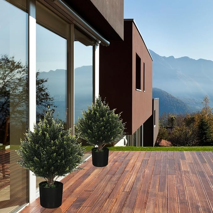 • Product size: The topiary trees artificial indoor in outdoor is19”*13”*13”, provided with a black plastic flowerpot with 4.5 inches height and 5 inches width. The height of cedar is measured from the bottom of flowerpot to the leave atop the cedar, and the width of cedar is measured from the leftmost leave to the rightmost leave,The products are made manually. It is normal to have 1 inch error in measurement. Please be prudent in buying if you mind it