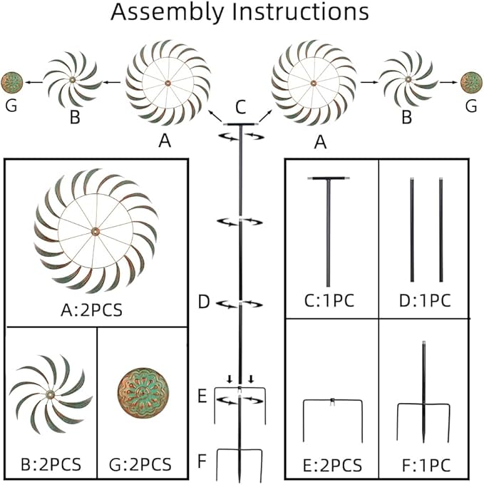 • Easy to Install: This large yard wind spinners have a simple and easy to install structure, without the need for any additional tools. Just follow the accompanying instructions for 3-5 minutes and you can quickly enjoy a happy courtyard life