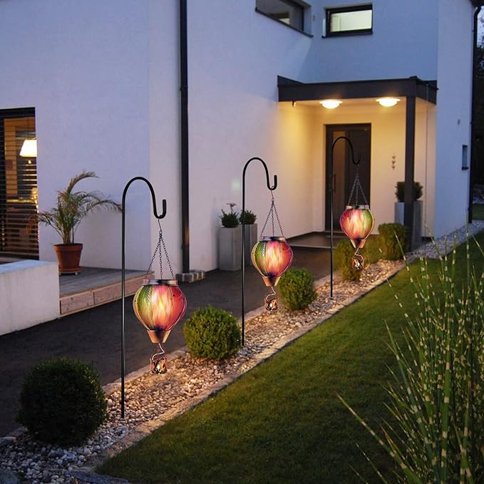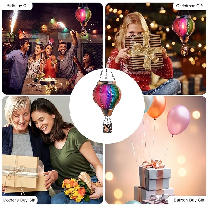• 【Wide Application】-- Hot air balloon lantern with a chain hook, you can hang the solar light on porches, trees, pergolas, balconies, or ledge. Add elegance and color to your outdoor space with this beautifully crafted solar-powered lantern. Perfect gift for your friends and family.