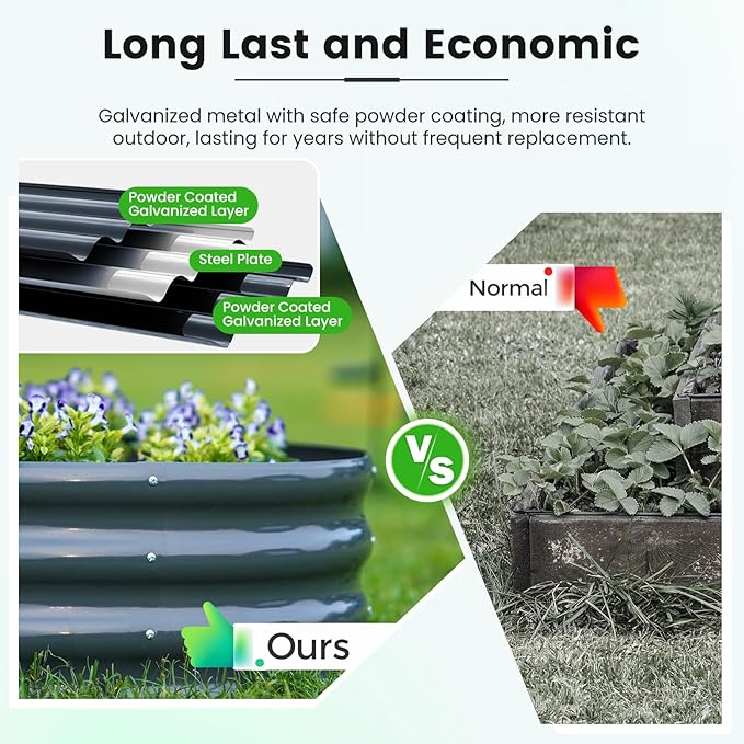 • 【Safe Rolled Edges】The edges of the metal planter raised beds are meticulously crafted with a rolled edge process, eliminating sharp edges to ensure your hands stay safe from cuts during assembly and planting, letting you safely enjoy the pleasure of gardening.