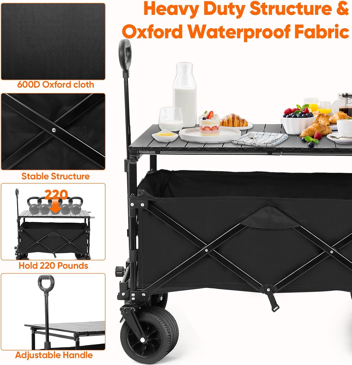 Collapsible Wagon with Table, Large Capacity Foldable Wagons Carts, Beach Wagon with Big Wheels, Heavy Duty Beach Car Utility Wagon for Outdoor Park, Shopping, Sports, Camping, Garden