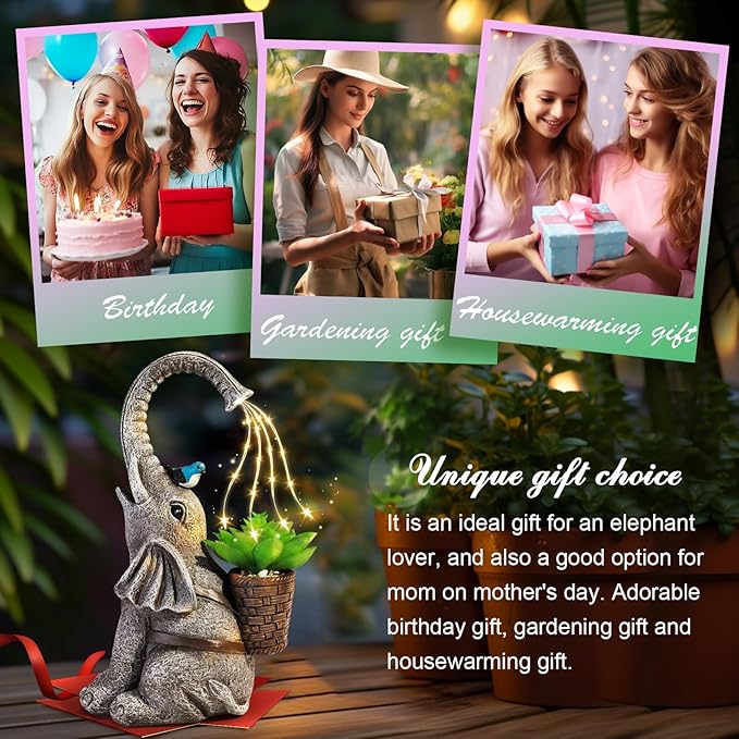 • Elephant Decor for Garden : The elephant carries succulents and comes with a solar-powered light strings, making it a unique outdoor decor for your garden, yard, backyard, balcony or lawn. Add a touch of elegance to your garden with this charming elephant statue