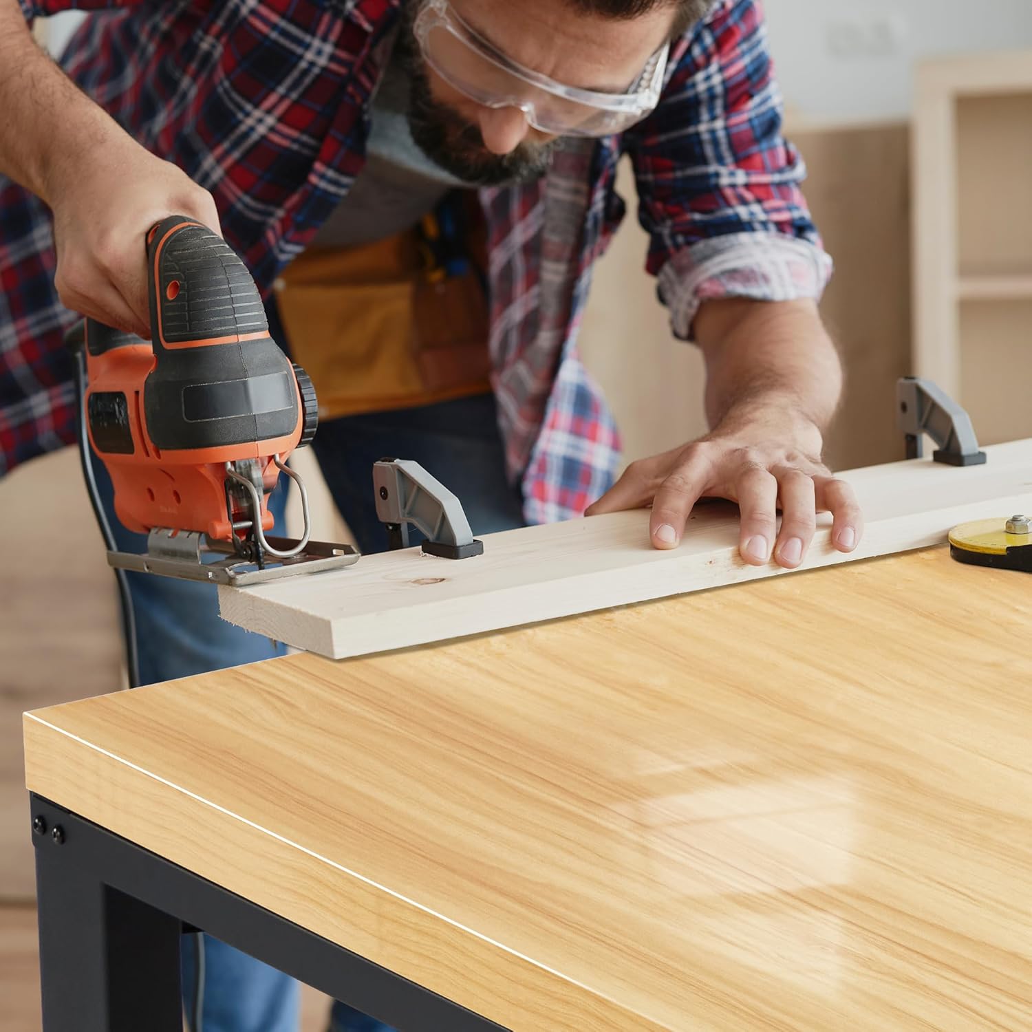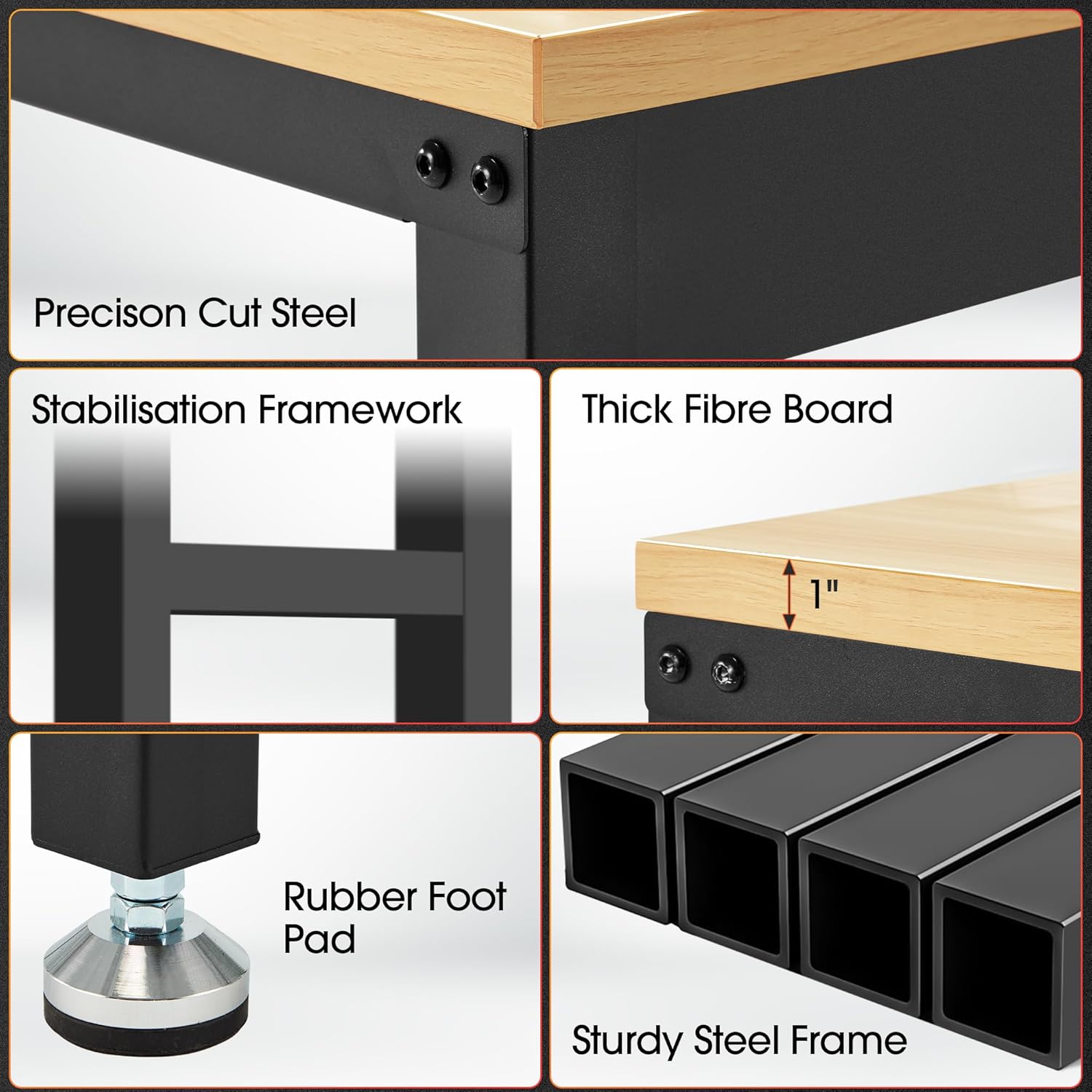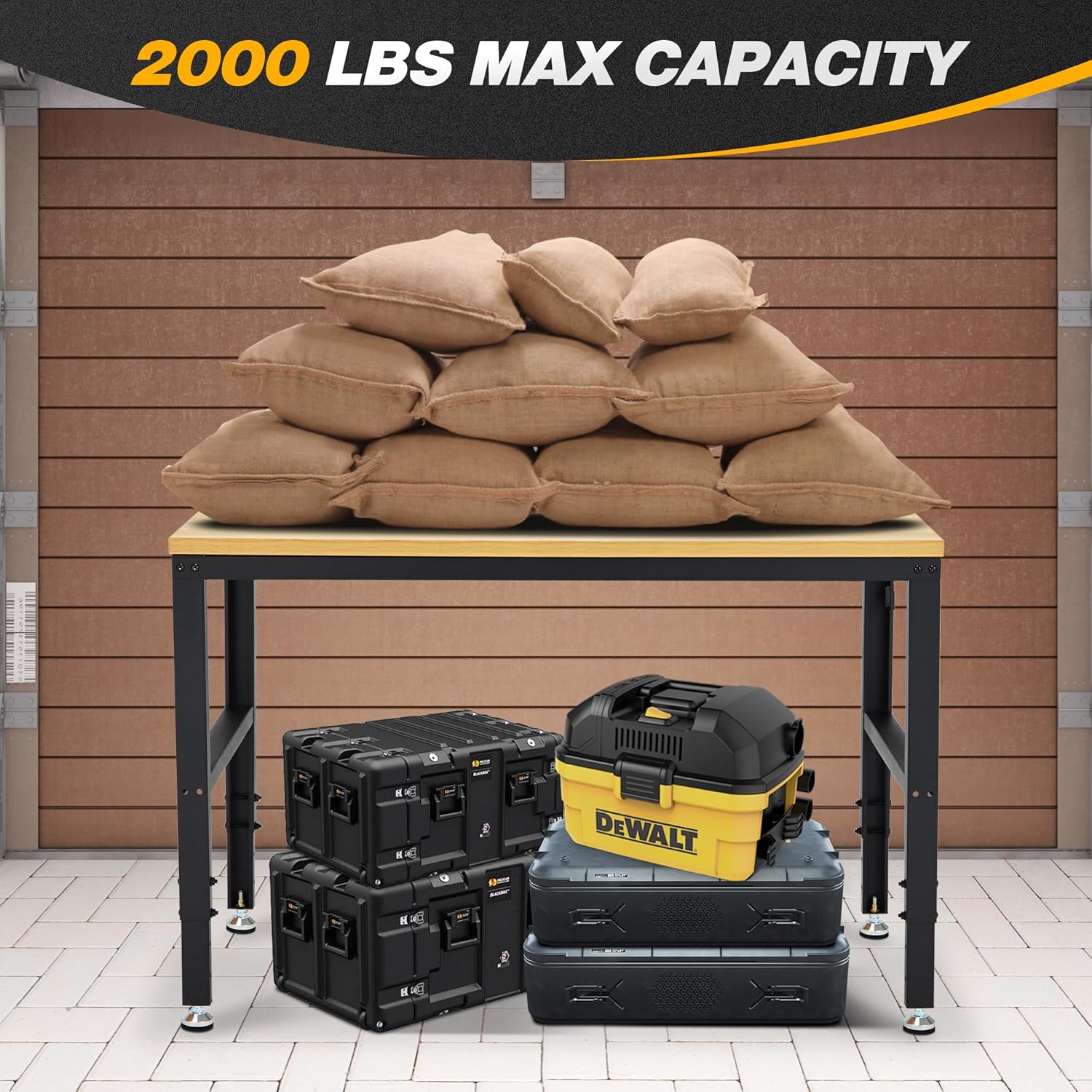 • Heavy Duty Work Bench: Constructed of high quality materials, the workbench consists of a 1" thick wood board tabletop and black textured steel frame that withstands powerful impacts up to 2000 lbs