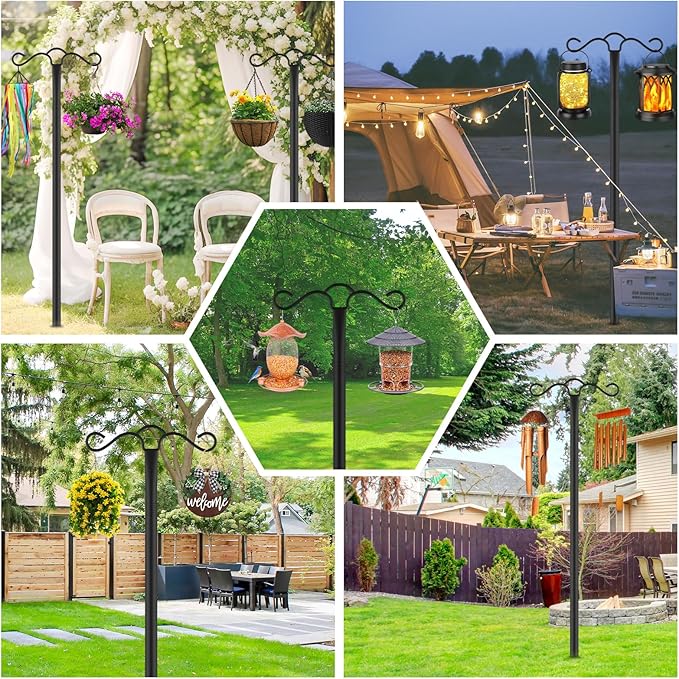 • [DOUBLE ARM DESIGN] This uniquely designed pole features a double arm design at the top of the pole, the arm-like sections provide you with a combination of elegance and functionality. The double arm design not only provides more hanging and display space, but also adds a distinctive look to your patio or garden. You can hang a variety of items such as flower baskets, bird feeders, lanterns, and more on each arm section to create a unique and charming landscape. Made from high quality materials, this stand is durable and suitable for a variety of outdoor environments.