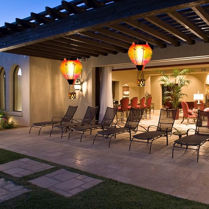 • 【Weather Resistance】Glass hot air balloon solar light is 18.1"H. Outdoor hot air balloon solar flickering flame lights are mainly made of textured stained glass and high qualty metal. Hot air balloon solar lamp is waterproof and not easy to fade, suitable for many kinds of weather.