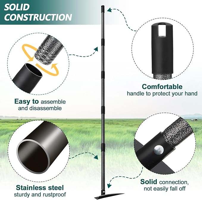 • Adjustable Handle Length: The weeding hoe's handle can adjust to 60" to accommodate gardeners of different heights. The ergonomic long handle can help protect your back and waist by reducing the need to bend. Length adjustment is quick and easy, just add or remove extension rods!
