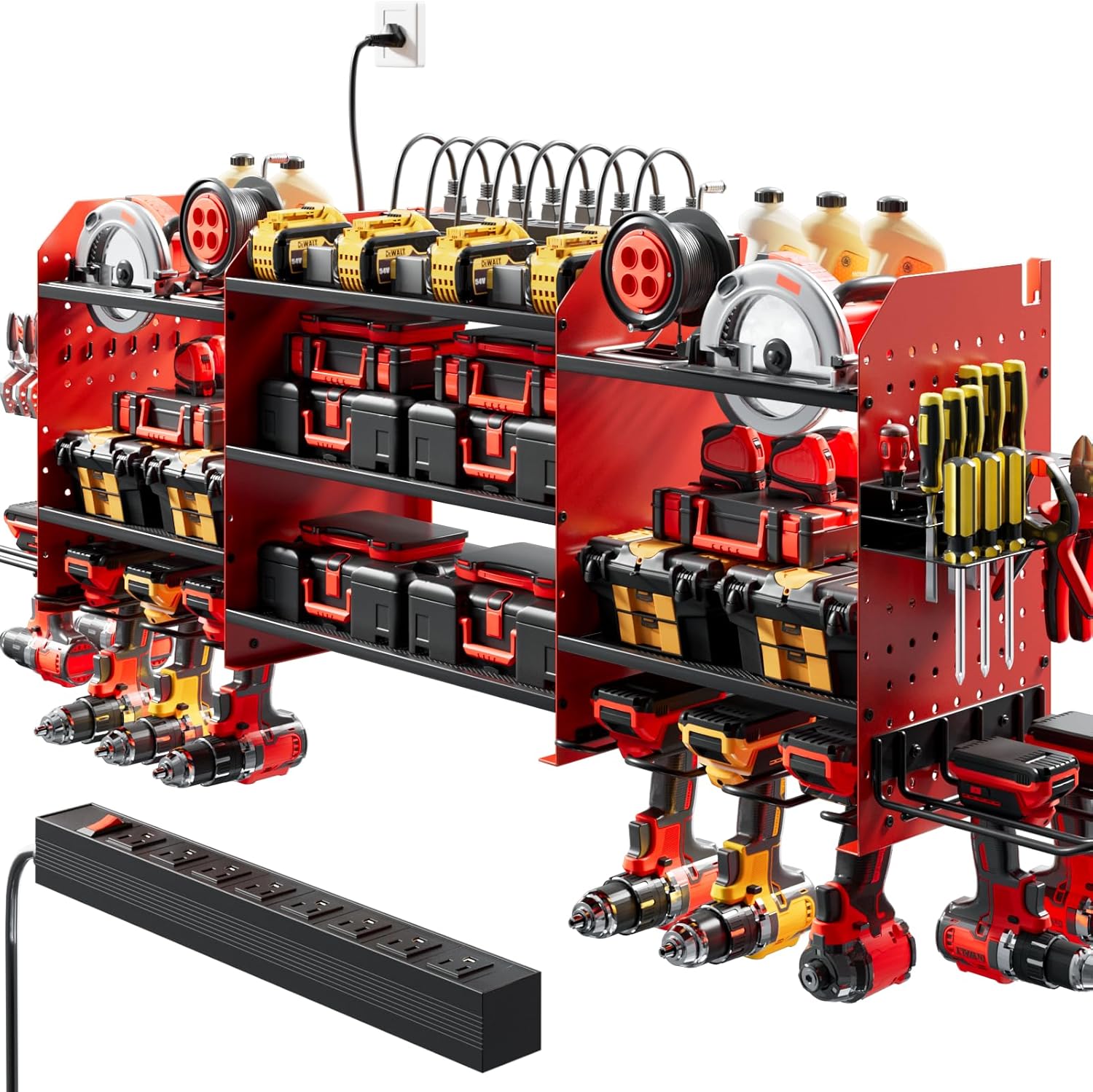 • [High-Capacity Storage]Wall mount power tools organizer features 10 drill holder, alongside a built-in power strip. Its double layer structure keeps rechargeable tools organized in the work area, saving bench space. Notably, the spacing between the middle tiers is significantly larger than typical market offerings.
