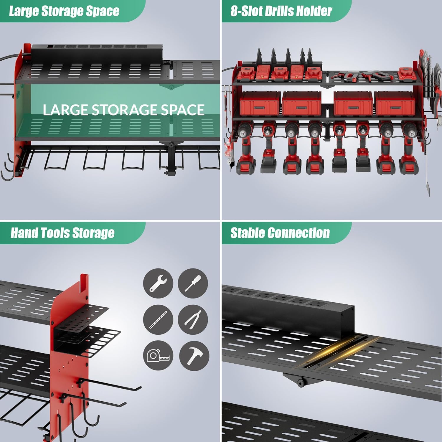 Suchtale Power Tool Organizer with Charging Station,33.2" Garage 8 Drill Holders Wall Mount,3 Layers Heavy Duty Metal Tool Shelf Built in 8 Outlets Power Strip, Gift for Men, Father, Red