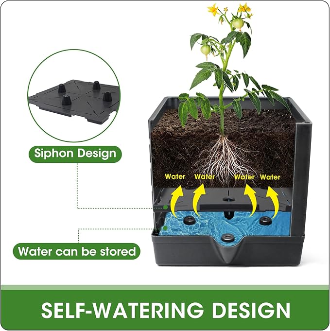 • SELF-WATERING SYSTEM: Self watering tomato planter with trellis has a built-in reservoir that ensures the plants receive consistent hydration. The bottom grid design utilizes the siphon effect, allowing the roots to pump water efficiently, minimizing the risk of under-draining or over-draining. There is a water injection port on the side, and the right amount of water is poured into the sowing box, without daily watering.