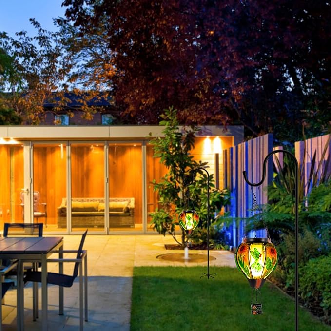 • 【Hummingbird Solar Hot Air Balloon】Hummingbirds and sunflowers on our outdoor solar lanterns are brightly colored and cleverly designed, every piece of glass is hand-painted. The hot air balloon solar lantern have built-in flame LED lights that create a realistic simulated flame effect to add color to your garden at night.