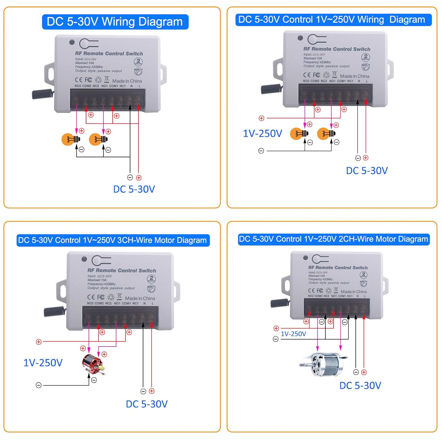 • 🍁【 wide applications range】The remote switches are used in industrial homes, farms, factories, offices, laboratories, supermarkets fields etc. Other applications, such as wireless monitoring equipment, Power switch, small motor, buzzer, electromagnets, light, electronic power supply equipment,, Motors, Fans, Cameras, Video signals, Audio signals, electrically operated Doors/ Locks/ Windows, ventilation devices, signal transmission.