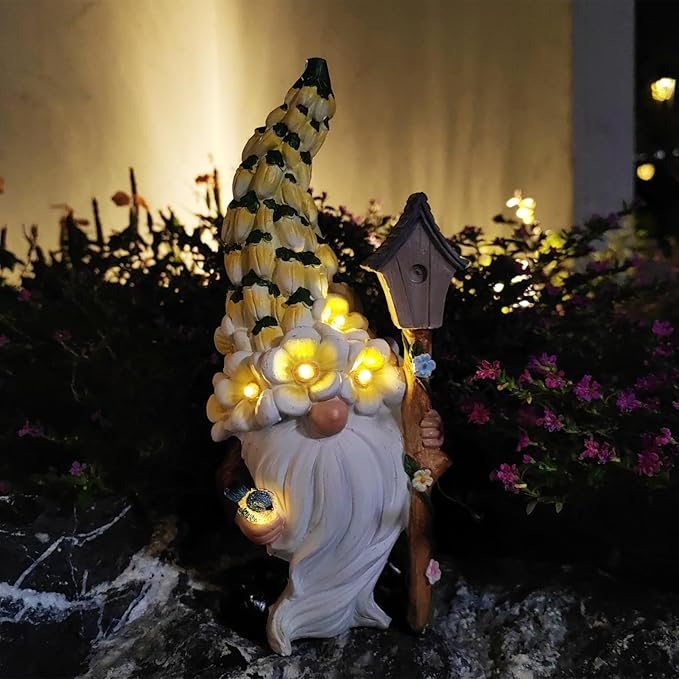 • Cheerful Design: This adorable gnome features a colorful flower hat that adds a playful and cheerful touch to your outdoor decor.