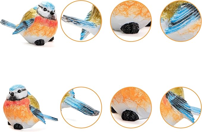 • Measurement & Material:The item is including 2 pieces of bird statues,each size is about 3.9”x2.5”x2.9”&0.2LB.They look similar but not identical.They are chubby and adorable,carved with bright shades of orange,yellow and blue.It can be place in garden and will not tip over easily.