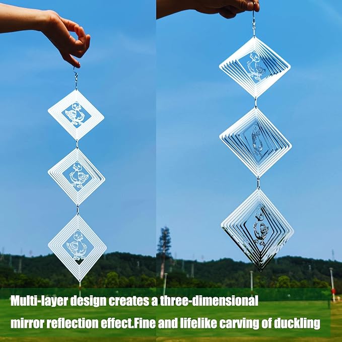 • These are 9 swivel hook and 9 ducks shape bird scare of very shiny reflective matel wind spinners can rotate easily in the breeze.Individual duck wind spinners are 9.25inch in length, you can connect them as long as you need.protect your garden, farm, and lawn by creating a bright flash that scares away birds.
