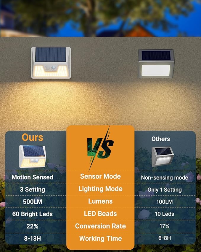• 【Faster Charging-Longer Illumination】:This solar motion activated light boasts a supercharged solar panel with a 20-22% conversion rate, meaning it charges up quicker during the day. That translates to longer illumination at night, keeping your outdoor space brightly lit for enhanced safety and security