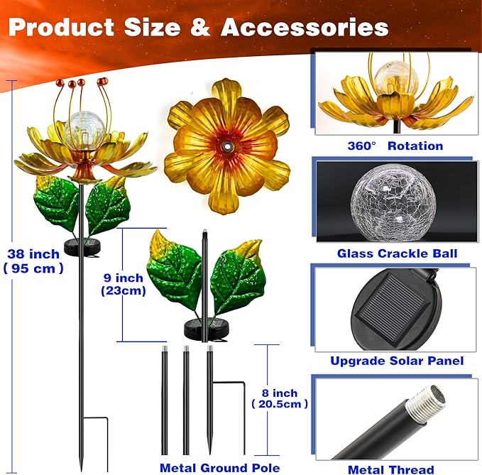 • 【 Easy to Install 】Wind Spinner Outdoor Metal is very easy to install, just twist all the accessories to install. The metal pole, the angle of the petals can be adjusted, you can also adjust the length of the pole and the degree of bloom of the flowers.