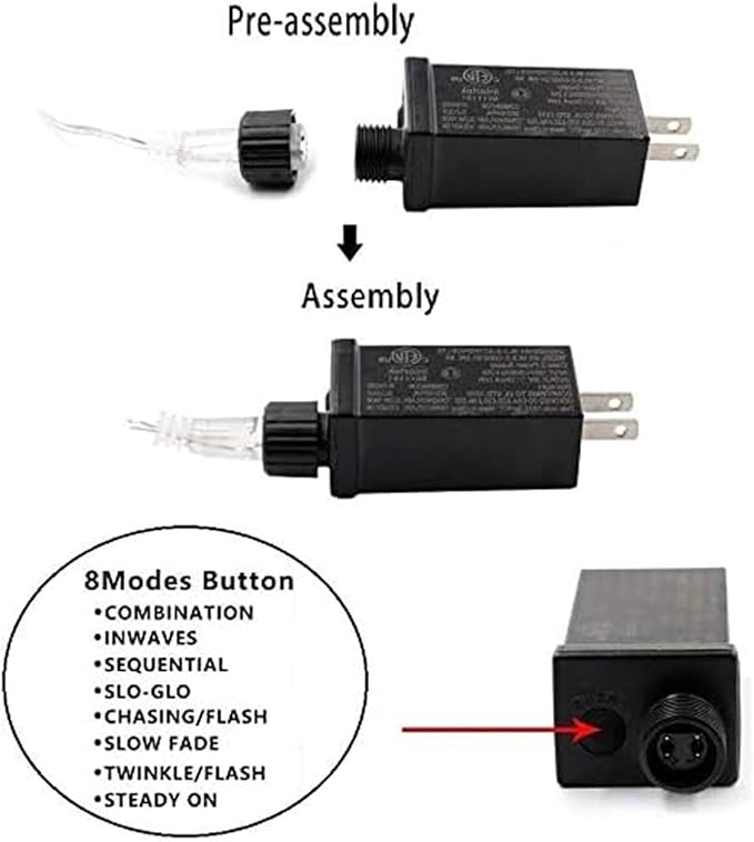• 8 Modes & Multiple Choice: Press the button on the transformer to choose from the 8 different light effects: Combination, In Waves, Sequential, Slo-glo, Chasing/Flash, Slow Fade, Twinkle/Flash, and Stay On. Switch modes on demand, rich choice for you to create a beautiful and gorgeous festive atmosphere.