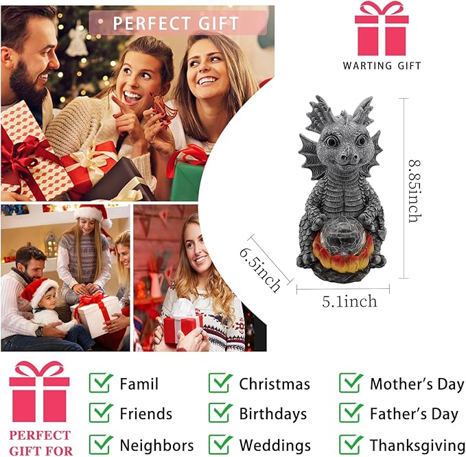 • 【Unique Dragon Design】This cute Grey Dragon outdoor decor With 7-Color Changing Solar Crackle Globe Lights, 7-color light cycle change,adds a touch of magic to your outdoor space. Dragon statue 6.5"x 5.1"x8.85" size ensures it becomes a focal point in your garden, pathway, or even on a wide windowsill, leaving a lasting impression.