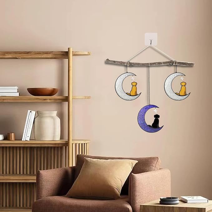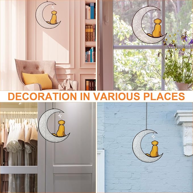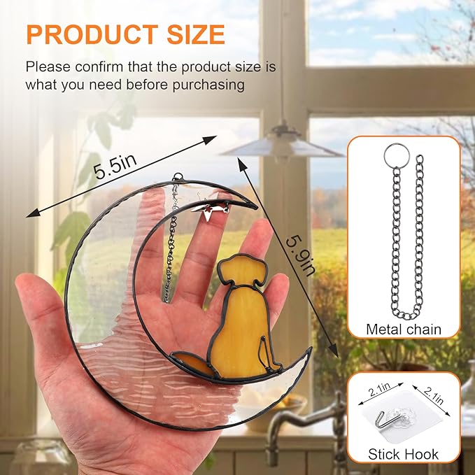 • 🐾【Easy To Hang Pet Memorial Suncatcher】Each stained glass window hangings dog grief gift will be packed in a box, included iron chain and sticky hooks. Dog bereavement gifts size:5.5''x5.9'', 1.2" sticky hooks.You can indoor window hanging for bedroom, bathroom, kitchen, cafe, office, classroom, porch, balcony, etc.