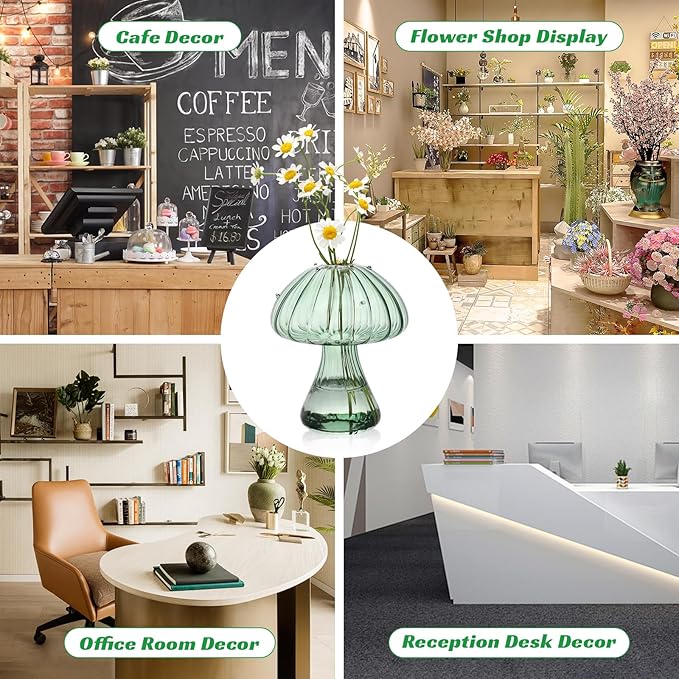 • Cute Mushroom Decor Planter: This is a set of 6 hydroponic glass vases with redesigned shapes and coordinated colors to create an oceanic, free-spirited feeling for your indoor environment. You can create more personalized uses, such as flower arrangements, creating micro-landscapes, or replacing aromatherapy stick containers and so on.
