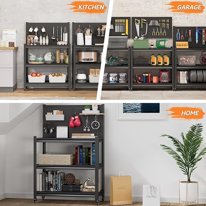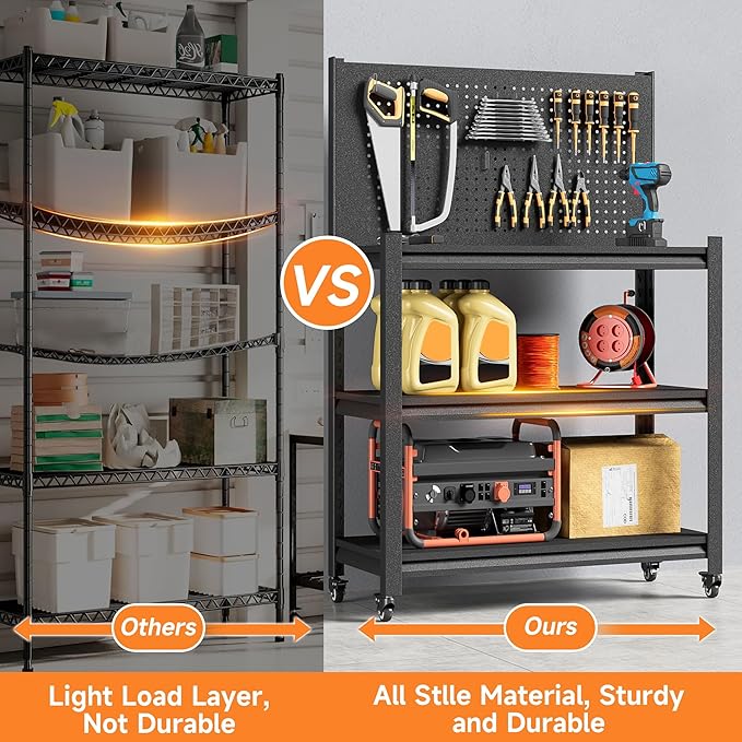 • 【Anti-Rust & Multi-Function】Optimized and upgraded metal workbench features a pegboard and 3-tier dividers. You can customize the shelf layout and use your imagination to customize your space. This workbench offers flexibility with its upgraded metal wheels. With four lockable wheels, effortlessly roll it around both indoor and outdoor spaces.