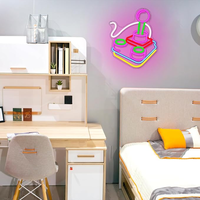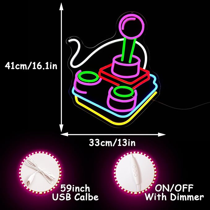 • Safe Material:colorful retro joystick led neon sign made of LED tube technology and silicone tubes and strong and transparent acrylic,game neon lights signs size is 16"x13"(41*31cm),game room decor light up your bedroom,add romantic for wall decoration!