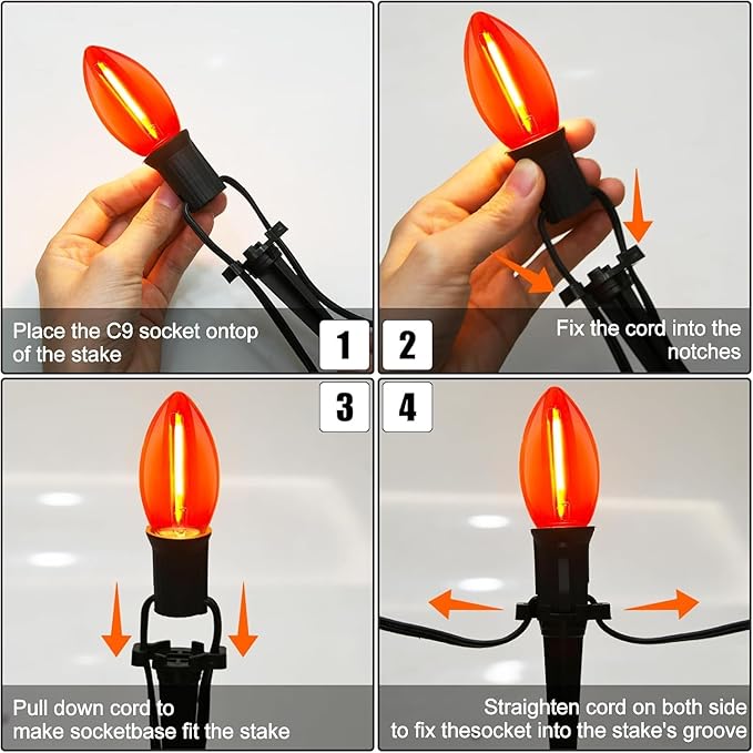 • ✨Practical and waterproof: C9 outdoor halloween pathway marker string lights is hanging and plugging, Hang up C9 orange purple string lights around your roofline decorations or plug in the C9 halloween walkway stakes lights in lawn garden. Halloween sidewalk lights made of plastic, shatterproof and IP44 waterproof, can withstand extreme temperatures, rainy, windy, or damp climates.