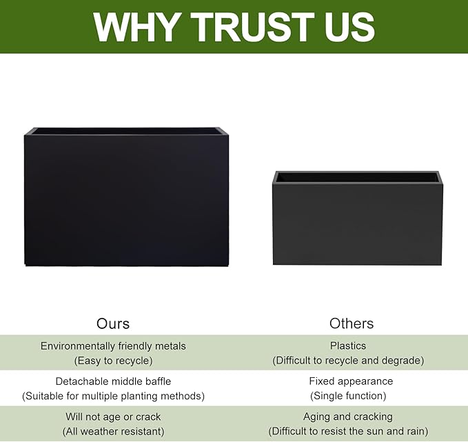 • ROBUST METAL CONSTRUCTION - Crafted from sturdy galvanized steel, this spacious planter boasts exceptional durability, ensuring it withstands outdoor elements without rusting or fading. Its weather-resistant design makes it suitable for year-round use in temperatures ranging from freezing cold to scorching heat, ideal for enhancing both indoor and outdoor settings.