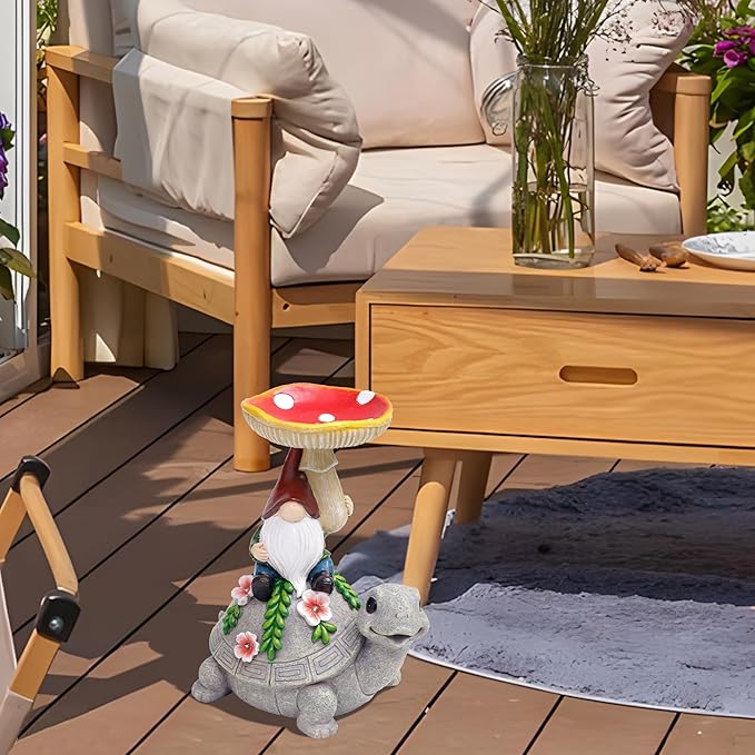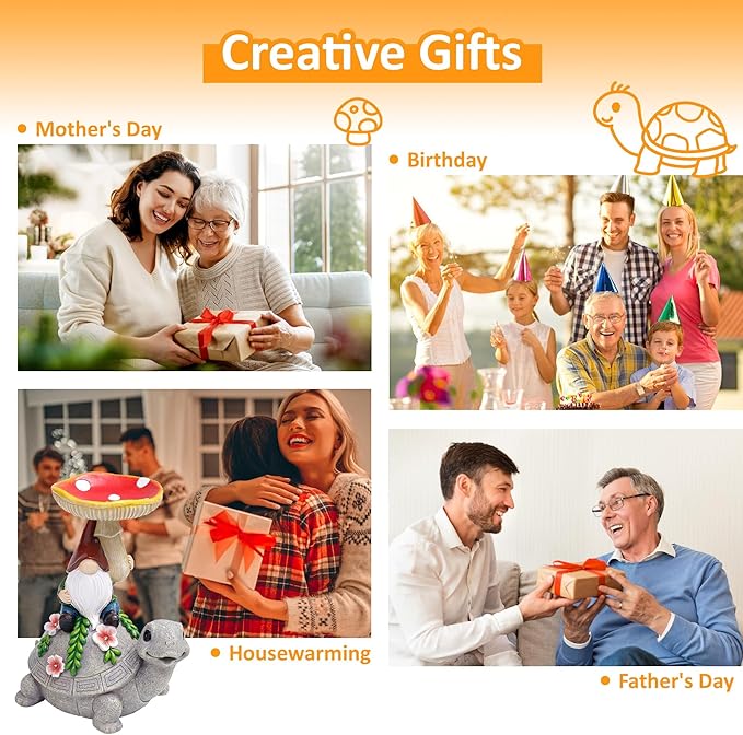 • 【Charming Garden Decor】The adorable garden turtle statue is the perfect addition to any garden. A dwarf with a mushroom and a cute turtle will attract wild birds and provide them with food, while also bringing life to your patio garden. This tortoise decor doubles as a high-quality garden lamp, perfect gift for moms and women