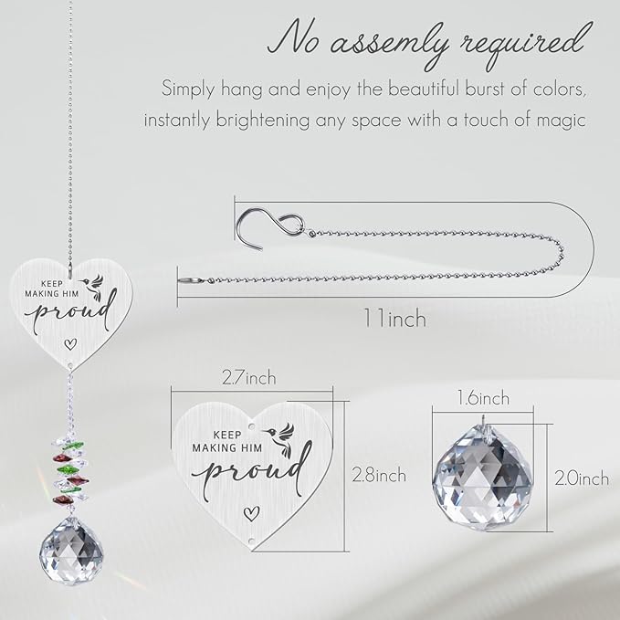 • Memorial hanging crystal suncatcher words read "Keep Making Him Proud," ,serving as a reminder of the enduring love and connection with a lost loved one. Telling those they left behind to live well and keep making him proud.