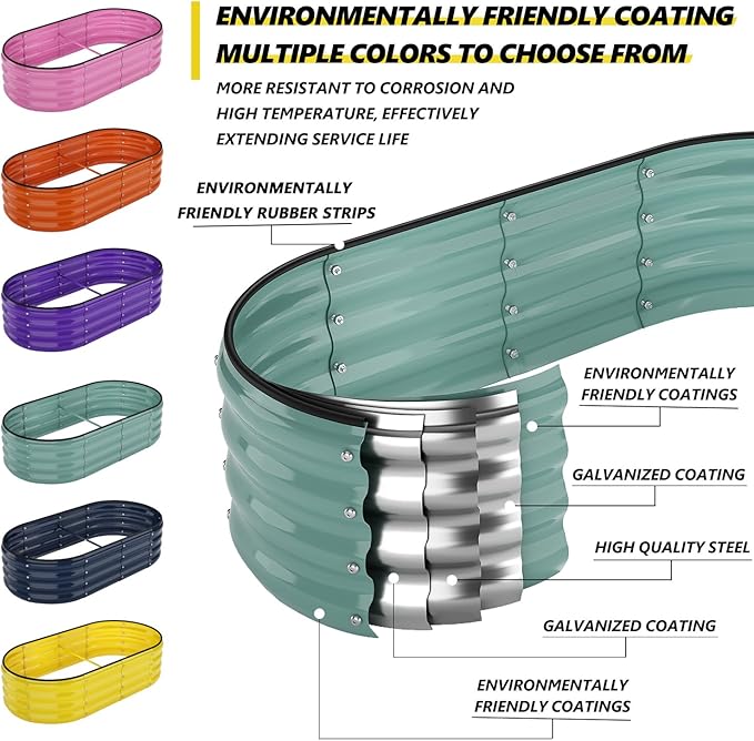 • Outdoor galvanized planter boxes size: 8×2×1 ft, Can hold garden soil and fertilizers: 15.14 Cubic feet. Available in a variety of colors, you can choose the one that best suits your garden style. Moreover, you can use galvanized sheets to splice out the size and shape you want. Use your design skills and imagination, and combine this galvanized garden beds outdoor with metal plant stakes to DIY your beautiful garden