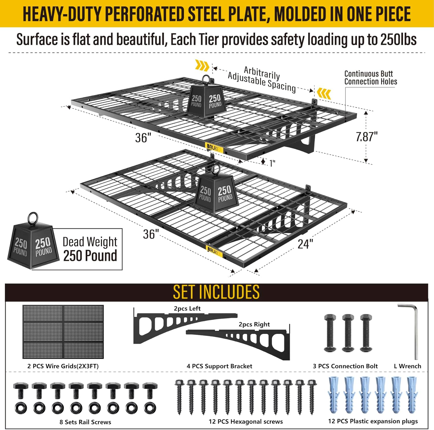 • KIT INCLUDES:Includes 1pc-Grid Shelf; 2pc-Brackets; 6pc-Hexagonal screws (Hardened ∅0.2" L/2"); 4Sets-Rail attachment bolts; 1pc- Drill bit; 1pc-Socket; 1pc-installation manual. All hardware of Brukid Professional Series Wall Mounted Shelf are under strict quality control and testing, We strive to provide our customers with a quality shopping experience, If you have any questions, Please feel free to contact us