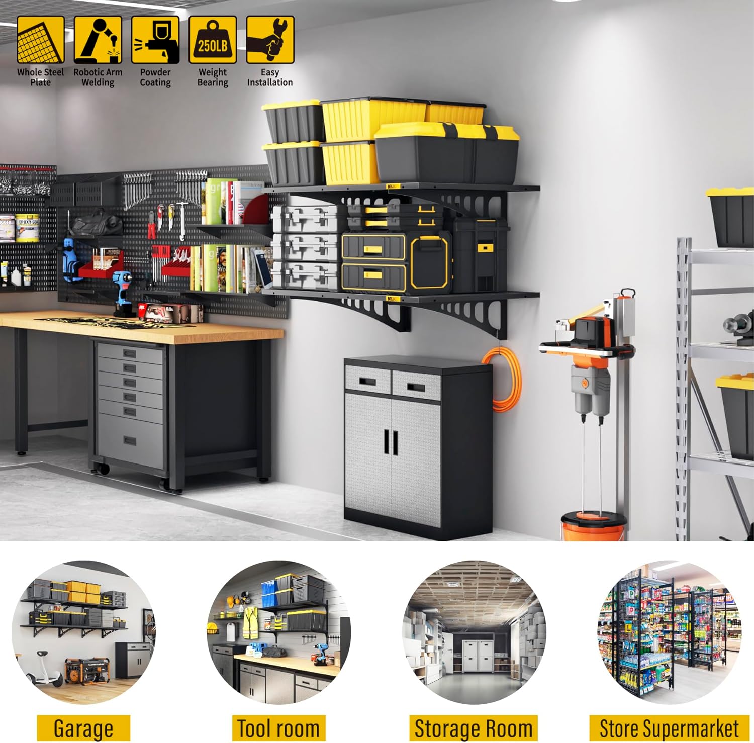 • SUPERIOR DESIGN: Wall shelf garage storage rack is made of heavy-duty frame structure and thicker wire mesh combined with welding, the panel and bracket connection is adjustable slide rail design, Both ends of the bracket can be installed freely in the 8"-45" range of wood wall keel spacing. Eliminating the worry of not being able to connect due to the mismatch of the spacing of the load-bearing wooden wall keel